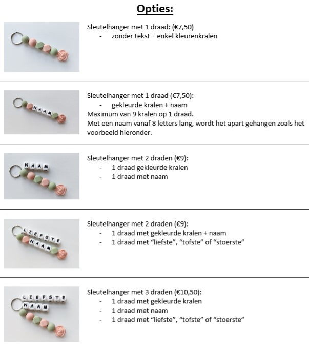 - Naam op een extra draad (+ €0,50): Gehele sleutelhanger zoals het voorbeeld wordt behouden, een extra draad met naam wordt hieraan toegevoegd.
